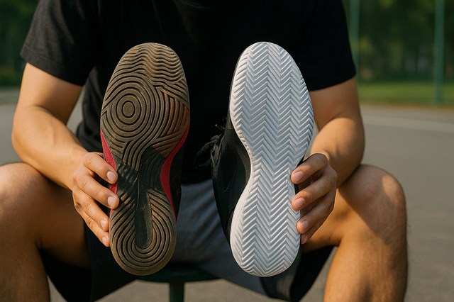 - グリップ力の低下(屋外): 室内用の細かいソールパターンは、屋外の砂埃を拾ってすぐに溝が詰まります。結果、アスファルトの上でツルツル滑ってしまい、急なカットやストップができず、転倒や怪我のリスクが激増します。