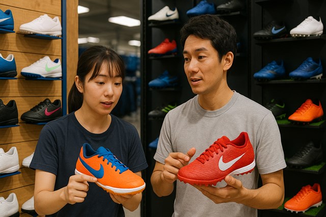 - トレーニングシューズ (TF): ソールに突起(イボイボ)あり → 人工芝・土のグラウンド用。滑らないためのグリップ重視。