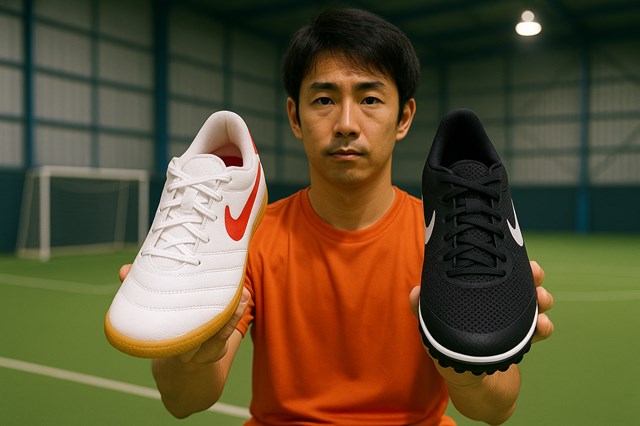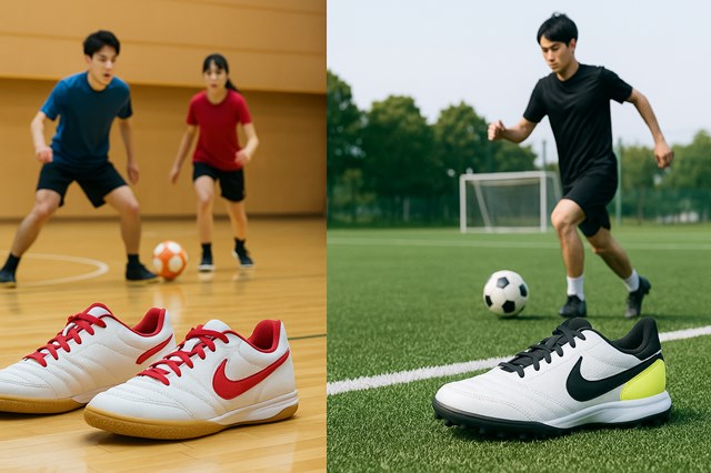 - フットサルシューズ (IN): ソールが平ら → 体育館・屋内コート用。足裏感覚と床へのグリップ重視。